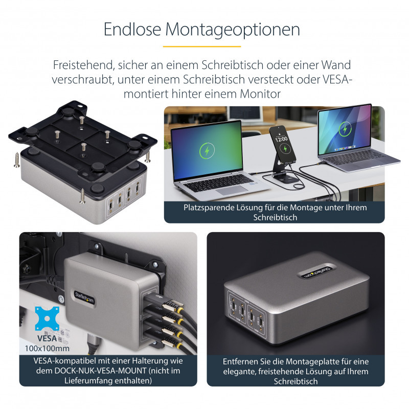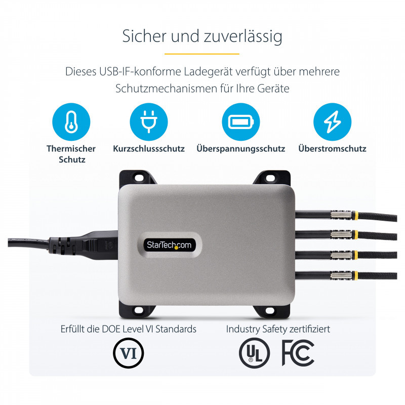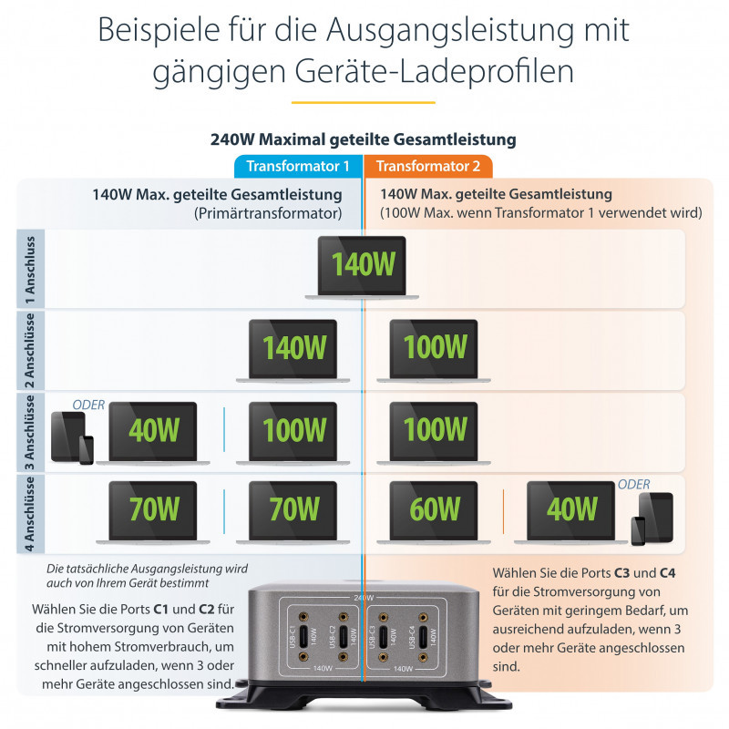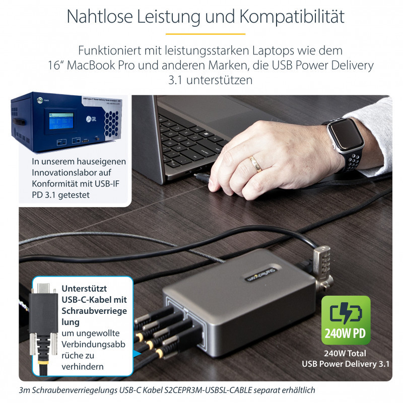 "StarTech.com 4-Port Multi-Device USB-C Charger, 240W Total, Single Port 140W EPR, PD 3.1, Screw Locking Ports, Boardrooms, Bracket incl. for Surface Mounting. Charger type: Indoor, Power source type: AC, Charger compatibility: Universal. Input voltage: 100 - 240 V, Maximum output voltage: 28 V. USB Type-C ports quantity: 4, Fast charging, Power protection features: Overheating, Over current, Over voltage. Cable length: 1.8 m, Product colour: Grey"\n"Power and charge up to 4 USB-C devices that support USB Power Delivery with this 240W quad USB-C GaN Laptop Charger