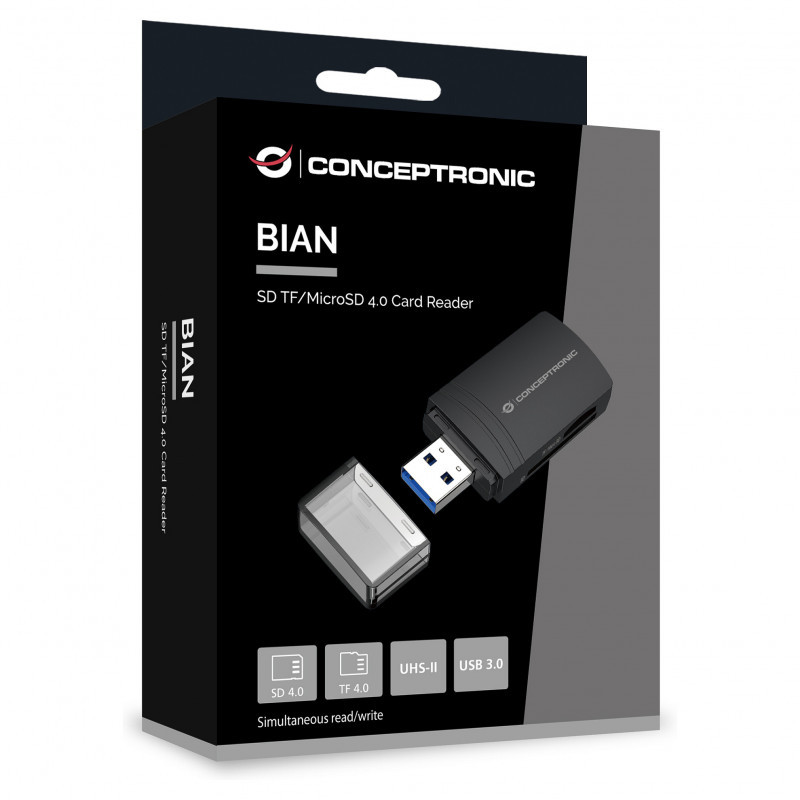 "Conceptronic BIAN06B SD TF/MicroSD 4.0 Card Reader, UHS-II, USB 3.0, 5Gbps. Compatible memory cards: MicroSD (TransFlash), MicroSDHC, MicroSDXC, SD, SDHC, SDXC, Product colour: Black, Data transfer rate: 5000 Mbit/s. Interface: USB 3.2 Gen 1 (3.1 Gen 1) Type-A. Width: 26.5 mm, Depth: 10.5 mm, Height: 57.5 mm. Package width: 75 mm, Package depth: 25 mm, Package height: 95 mm. Windows operating systems supported: Windows 11 Enterprise x64, Windows 10, Windows 11 Home, Windows 10 Education, Windows 11 Pro,..., Mac operating systems supported: Mac OS X 10.14 Mojave, Mac OS X 10.7 Lion, Mac OS X 10.15 Catalina, Mac OS X 10.7.5 Lion, Mac OS X..., Mobile operating systems supported: Android 7.1.2, Android 8.0, Android 8.1, Android 10.0, Android 9.0, Android 11.0, Android 12.0,..."\n"The SD/TF 4.0 Card Reader ensures steady and efficient data transmission, supporting SD/TF 4.0 and UHS-II with USB 3.0 transfer speeds up to 5Gbps. It also allows simultaneous reading and writing of two cards. As a USB-powered device, no external power is needed, making it an ideal companion for travel or everyday use."