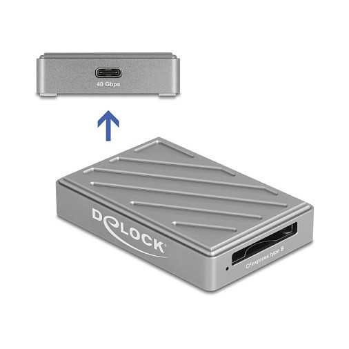 "DeLOCK 40 Gbps USB Type-C Card Reader for CFexpress type B memory cards. Compatible memory cards: CFexpress 2.0 Type B, Product colour: Grey, Data transfer rate: 40000 Mbit/s. Interface: USB4 Gen 3x2 Type-C. Width: 50 mm, Depth: 75 mm, Height: 14 mm. Quantity per pack: 1 pc(s), Package type: Hanging box. Cables included: USB Type-C to USB Type-C"\n"The card reader by Delock can be used for reading and writing CFexpress memory cards. The card reader can be connected to a PC or a mobile device via the USB interface. Thanks to the support of a maximum data transfer rate of up to 40 Gbps, even large amounts of data - such as 8K video recordings or RAW image series - can be transferred extremely quickly. The card reader is therefore ideal for professional users in the photo and video sector.