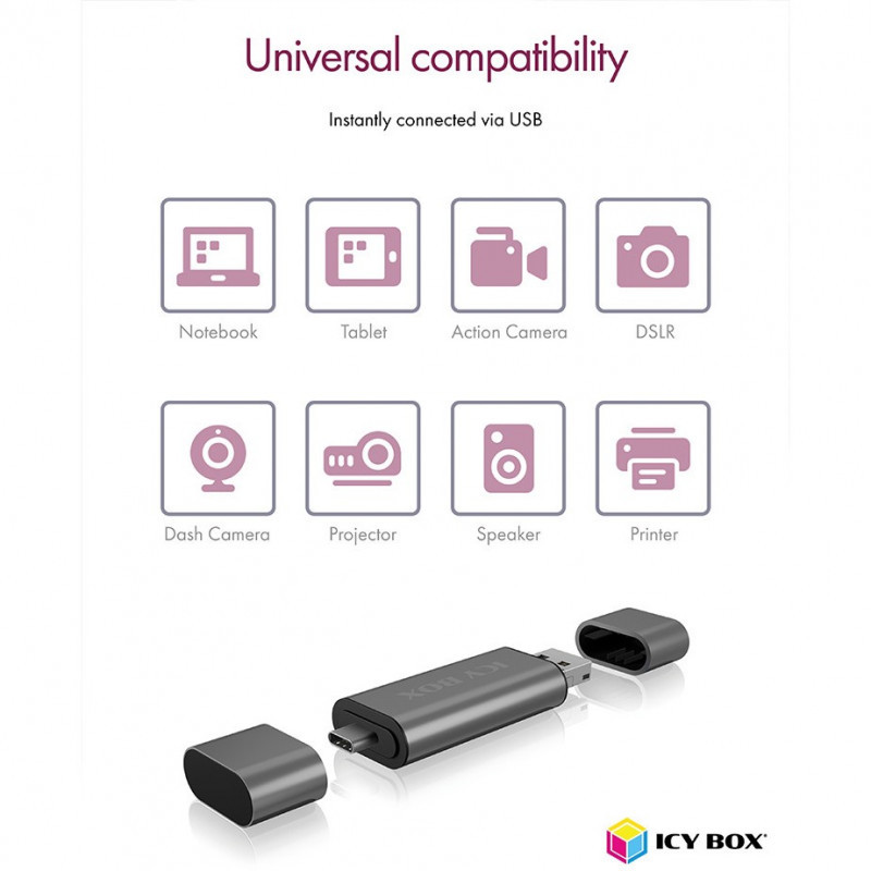 The IB-CR 200-C is the optimal card reader on the go. It allows the transfer of your data to the usual SD and microSD card formats up to 128 GB.