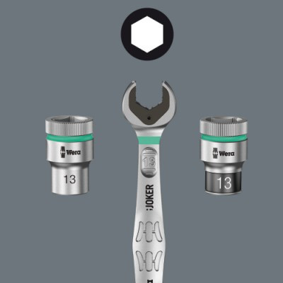 "Wera Joker Set 11 psc. Wrenches/sockets sizes: 8,10,11,12,13,14,15,16,17,18,19 mm, Product colour: Stainless steel, Material: Steel. Number of pieces: 11 pc(s)"\n"Ratcheting combination wrench; unique holding function, thanks to the metal plate in the jaw, reduces the risk of dropping nuts and bolts; replaceable metal plate in the jaw secures nuts and bolts with its extra hard teeth and reduces the danger of slipping; integrated limit stop prevents any slipping around the bolt head and allows higher torque to be applied; double-hex geometry makes for a positive connection with nuts or bolts and reduces the risk of slipping; return angle of only 30° at the open end to avoid time consuming flipping of the wrench during fastening jobs; ratchet mechanism at the ring end, with an exceptional, fine-tooth mechanism – 80 teeth in all – enables flexibility in very confined working spaces; specially forged geometry for high torque transfer and strength; high performance chrome molybdenum steel; nickel-chrome coating for high corrosion protection. Colour coding and forged dimension details to enable the desired JOKER to be easily located.