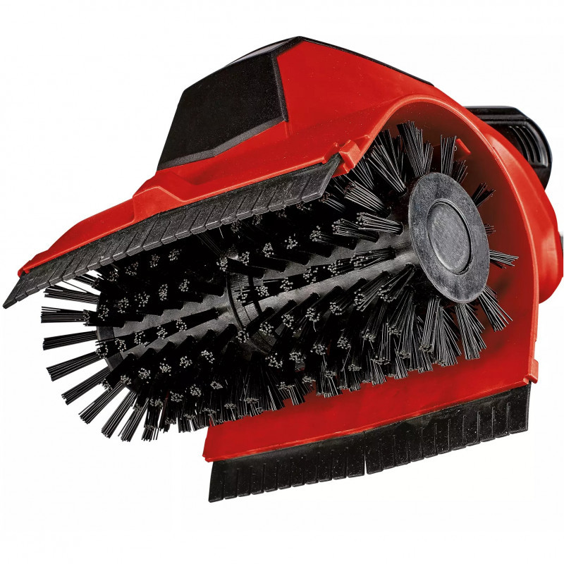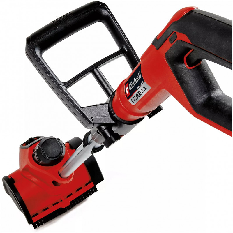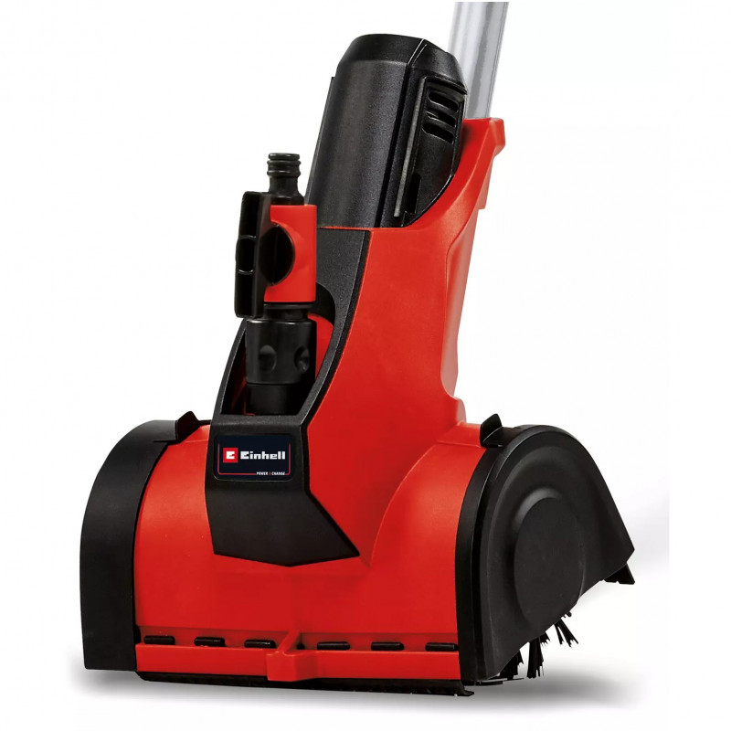 "Einhell PICOBELLA. Brush rotation speed: 1400 RPM, Brush diameter: 11.5 cm, Brush width: 21.5 cm. Power source type: Battery. Weight: 4.1 kg, Package width: 250 mm, Package depth: 215 mm"\n"The Einhell PICOBELLA cordless surface brush is a multifunctional supporter for cleaning and freshening up stone surfaces, wood, artificial turf and corners and edges. The PICOBELLA removes for example verdigris and moss from smooth, rough and sensitive surfaces. As a member of the completely interchangeable Power X-Change rechargeable battery system, the PICOBELLA can be used in combination with any system battery. Being a cordless tool the PICOBELLA can be used with flexibility anywhere in the home and garden – without dependency on sources of electricity. For easy wet cleaning in just one step there is an integrated garden hose connection to enable complete, thorough cleaning. Brushes can be changed at the press of a button, completely tool-free. A special side brush is suitable for perimeter work right up to the edge. The all-round guard hood guides the dirt in the right direction. Quick results are ensured by extra-wide rotating brush rollers. Flexible forward/reverse brush operation means maximum results can be achieved while the brushes are guided smoothly at the same time. Extra flexibility is also provided by infinitely adjustable speed control. The height-adjustable aluminium tube can be adjusted to individual requirements for back-friendly operation. In addition, the PICOBELLA has an ergonomic handle with soft grip and an additional handle with a practical integrated garden hose guide. The product is supplied complete with a MEDIUM brush for cleaning stone. The product is supplied without a battery or charger which are available separately.