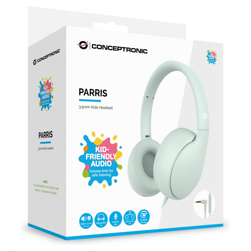 "Conceptronic PARRIS04GT 3.5mm Kids Headset. Product type: Headset. Connectivity technology: Wired. Recommended usage: Calls/Music. Headphone frequency: 20 - 20000 Hz. Cable length: 1.6 m. Weight: 180 g. Product colour: Light Green"\n"Perfect for school, home, and everyday use, this 3.5mm Kids Headset is built with safety, comfort, and durability in mind. The built-in 85dB volume limit helps protect developing ears, while the soft, adjustable design ensures a comfortable fit for extended wear.