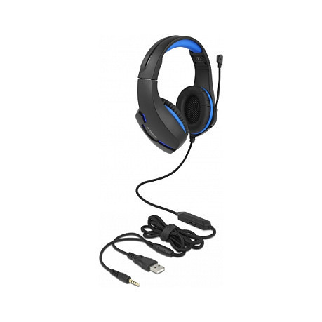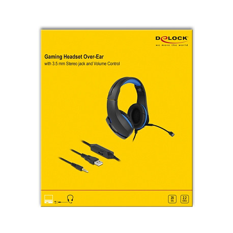 "DeLOCK Gaming Headset Over-Ear with 3.5 mm Stereo jack and blue LED light for PC, Laptop and Game Consoles. Product type: Headset. Connectivity technology: Wired. Recommended usage: Gaming. Headphone frequency: 20 - 20000 Hz. Cable length: 2.1 m. Weight: 230 g. Product colour: Black, Blue"\n"This gaming stereo headset by Delock has been developed for the playback and recording of audio signals, especially in the area of gaming. It is also suitable for skyping, video conferences or online courses.
