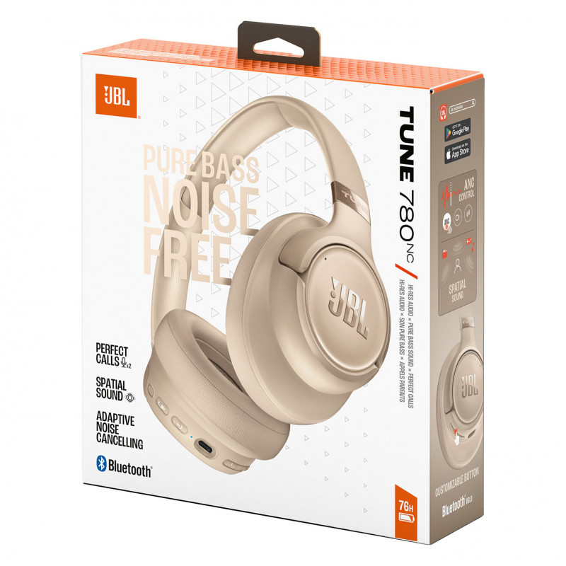 "JBL Tune 780NC. Product type: Headset. Connectivity technology: Wired & Wireless, Bluetooth. Recommended usage: Calls/Music. Headphone frequency: 10 - 20000 Hz. Weight: 225.2 g. Product colour: Beige"\n"Hi-Res JBL Pure Bass Sound plus Spatial Sound