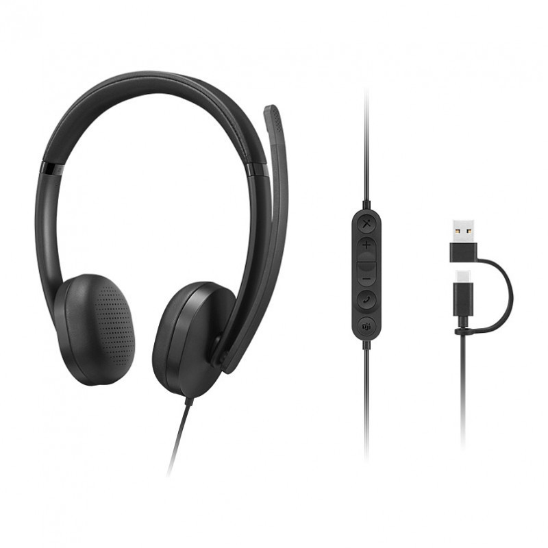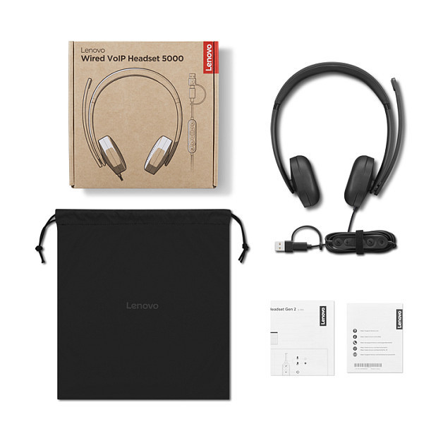 "Lenovo VoIP Headset 5000. Product type: Headset. Connectivity technology: Wired. Recommended usage: Office/Call center. Headphone frequency: 20 - 20000 Hz. Cable length: 1.9 m. Weight: 144 g. Product colour: Black"\n"The Lenovo Wired VoIP Headset 5000 is a Teams-certified professional headset that is designed for the workplace. The USB-C plug and USB-A converter make it plug-and-play-compatible with various devices. In addition, it is lightweight, portable and comfortable for all-day use. With the AI noise reduction on the LADM software, this headset delivers excellent noise cancellation in loud environments – making sure you are heard clearly all the time."
