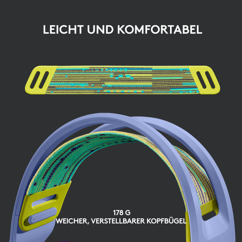 "Logitech G G733 Wireless Headset. Product type: Headset. Connectivity technology: Wireless. Recommended usage: Gaming. Headphone frequency: 20 - 20000 Hz. Wireless range: 20 m. Weight: 278 g. Product colour: Lilac"\n