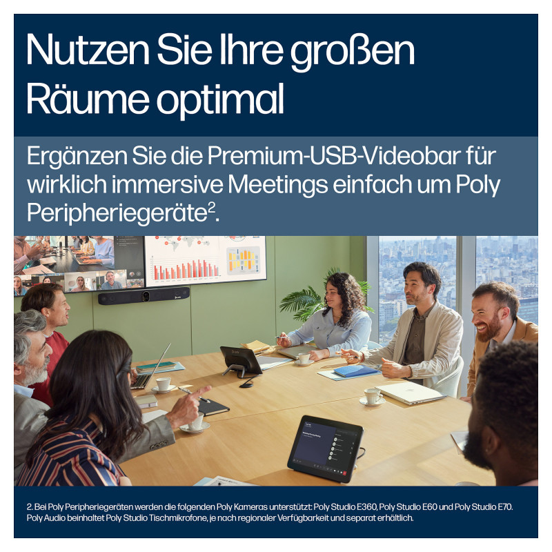 "HP Poly Studio V72 USB Video Bar. HD type: 4K Ultra HD, Maximum video resolution: 3840 x 2160 pixels, Supported video modes: 2160p. Digital zoom: 7.3x. Wi-Fi. Product colour: White"\n"Exceptional AV capabilities. USB simplicity