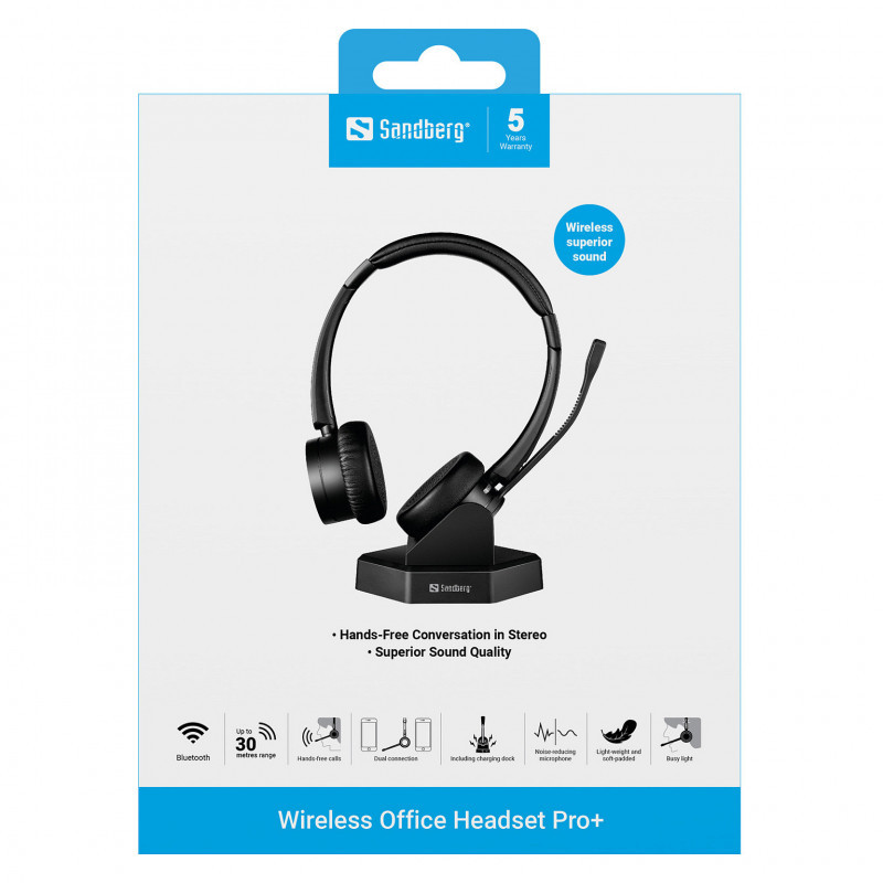 "Sandberg Wireless Office Headset Pro+. Product type: Headset. Connectivity technology: Wireless, Bluetooth. Recommended usage: Office/Call center. Headphone frequency: 20 - 20000 Hz. Wireless range: 30 m. Weight: 100 g. Product colour: Black"\n"Sandberg Wireless Office Headset Pro+ is a stylish and exceptionally comfortable wireless stereo headset, optimised for use with a mobile phone or for online conversations on your PC. It ensures crystal-clear voice reproduction. The headset can be connected with two devices simultaneously; for example, both your PC and your mobile phone. With an integrated “busy” light-emitting diode, enabling your colleagues to easily see whether you are busy with a conversation in the headset. The package includes an elegant base, in which the headset can be recharged when it is not in use."