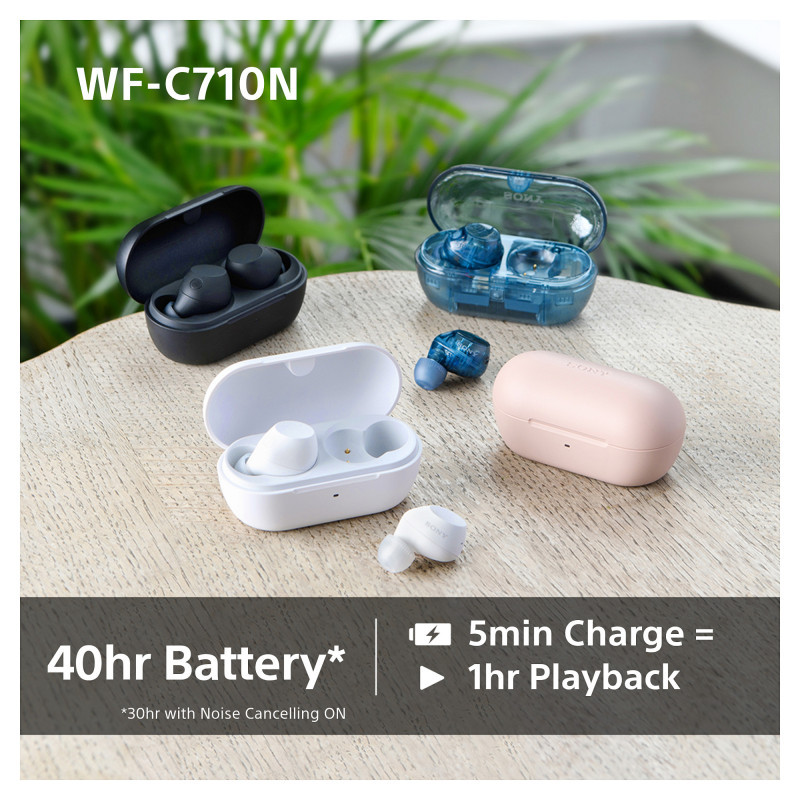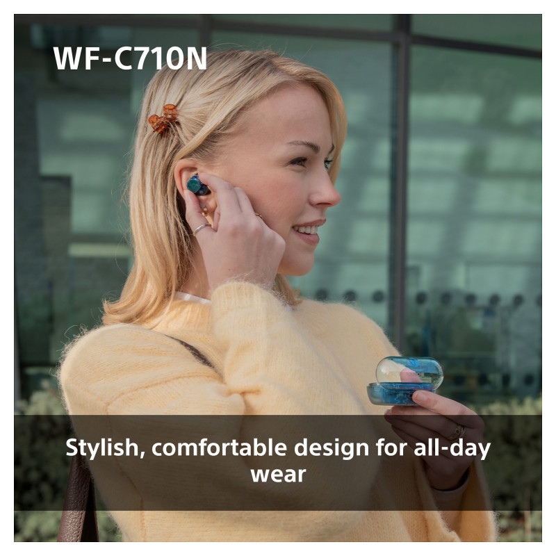 Available in Black, White, Pink, and Glass Blue (an exciting transparent design), the WF-C710N are small, lightweight and comfortable, so you can wear them all day long, and focus on your music in style.