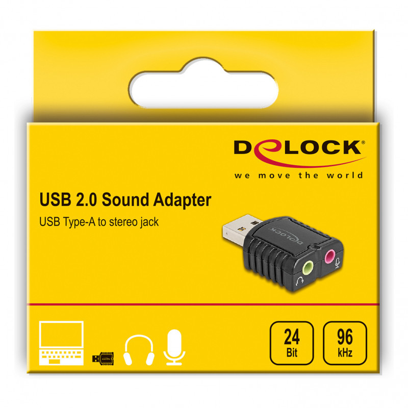 "DeLOCK 65964. Connector 1: USB Type-A, Connector 2: 3.5 mm. Product colour: Black"\n"The sound adapter by Delock expands a computer, laptop or tablet-PC with an additional external sound card.