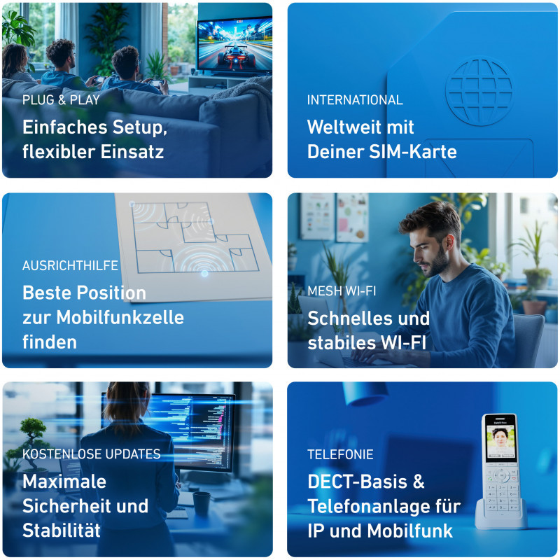 High-speed internet via 5G, all FRITZ! features in a compact housing: The FRITZ!Box 6860 5G is suitable for outdoors and can be installed indoors or in protected outdoor areas – for example on a window – for top mobile reception. Get the most out of the integrated DECT base station: pair up to six cordless phones or make phone calls via with VoLTE/VoNR with the SIM card number.