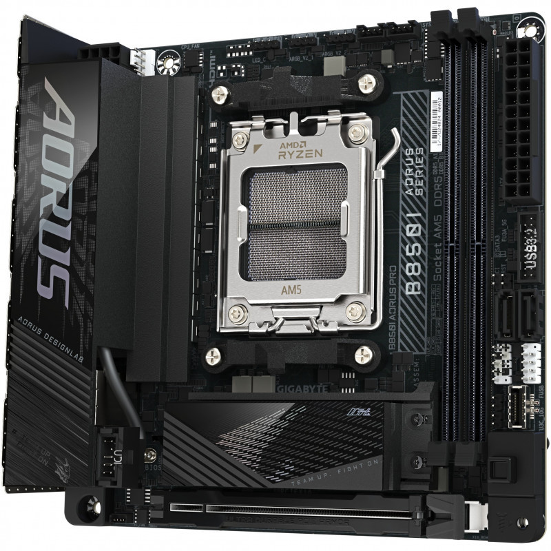 "GIGABYTE B850I AORUS PRO Motherboard - AMD Ryzen 9000 Series CPUs, 8+2+1 Phases Digital VRM, up to 8400MHz DDR5 (OC), 1xPCIe 5.0 + 1xPCIe 4.0 M.2, 2.5LAN, WIFI 7, USB 3.2 Gen 2. Processor manufacturer: AMD, Processor socket: Socket AM5, Compatible processor series: AMD Ryzen 7000 Series, AMD Ryzen 8000 Series, AMD Ryzen 9000 Series. Supported memory types: DDR5-SDRAM, Maximum internal memory: 128 GB, Memory slots type: DIMM. Supported storage drive interfaces: M.2, SATA III, Supported storage drive types: HDD & SSD, RAID levels: 0, 1, 10. Maximum resolution: 4096 x 2160 pixels. Ethernet interface type: Gigabit Ethernet, Top Wi-Fi standard: Wi-Fi 7 (802.11be), Wi-Fi standards: 802.11a, 802.11b, 802.11g, Wi-Fi 4 (802.11n), Wi-Fi 5 (802.11ac), Wi-Fi 6 (802.11ax), Wi-Fi 6E..."\n"Elevate your computing experience with GIGABYTE's renowned motherboard series: AORUS, AERO, and GIGABYTE. Featuring innovative designs and advanced features, these boards offer exceptional performance and reliability. Whether you're a gamer, content creator, or professional, our series cater to your needs, ensuring uncompromising quality and cutting-edge"