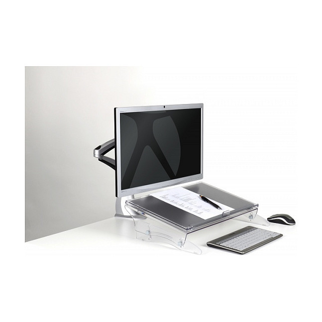 Easily pull the anti-reflecting satin surface towards you and take notes on it. The smooth-running rails allow the platform to slide forward. The high-quality acrylic material makes the FlexDesk 640 stable, and the transparent design ensures that your desk does not look overloaded. The FlexDesk 640 provides great features like three levels of height adjustment between 110 and 180 mm, anti-slip-feet, foam edge for the outer edge of the hand, high sliding edge for heavy file folders, a load capacity up to five kg, and a hidden pen-tray. Start working in a line with the FlexDesk 640 document holder and increase your working comfort and productivity."
