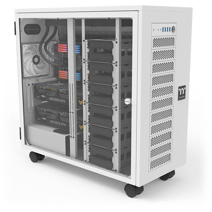 "Thermaltake AX700 TG. Form factor: Tower, Type: PC, Product colour: White. Front fans diameters supported: 120,140 mm, Side fans diameters supported: 120,140 mm, Rear fans diameters supported: 120,140 mm. Supported HDD sizes: 2.5,3.5,5.25"". Width: 324.6 mm, Depth: 685 mm, Height: 645 mm"\n"The AX700 TG Super Tower Chassis is a high-performance workstation super tower designed for content creators, gamers and AI computing, providing superior performance, storage, and cooling. It supports XL-ATX motherboards, five graphics cards, and up to eighteen hard drives for demanding tasks. With space for eighteen fans and large radiators, it ensures optimal airflow and hardware longevity.
