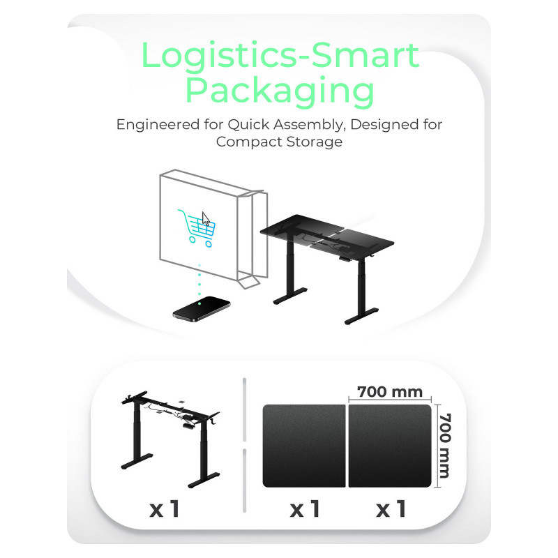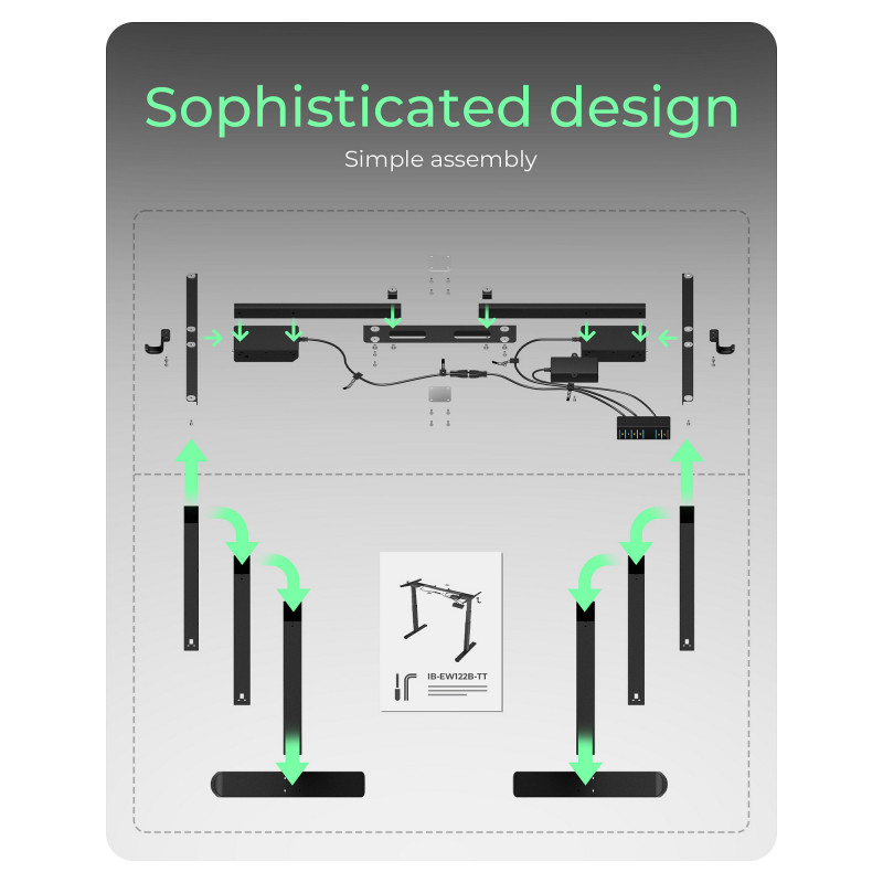 "ICY BOX IB-EW122B-TT. Product colour: Black, Maximum weight capacity: 100 kg, Height adjustment range: 630 - 1280 mm. Width: 1400 mm, Depth: 700 mm, Height: 750 mm. Package weight: 35.9 kg. Products per master (outer) case: 1 pc(s). AC input voltage: 100 - 240 V, AC input frequency: 50/60 Hz"\n"Ergonomic desk frame