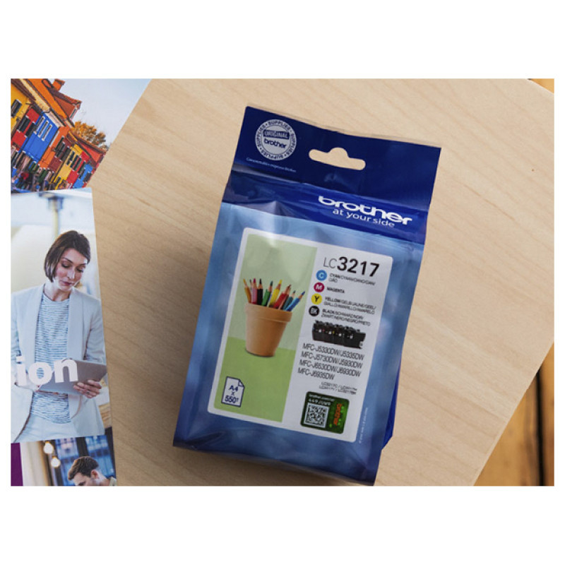 "Brother LC3217VAL. Supply type: Multi pack, Colour ink page yield: 550 pages, Printing colours: Black, Cyan, Magenta, Yellow, Quantity per pack: 4 pc(s), Black ink page yield: 550 pages"\n"Looking for a cartridge that offers effortless performance every time you print? The Brother LC3217VAL value pack (including black, cyan, yellow and magenta ink cartridges) guarantees smooth, reliable and top quality printouts from your first to your last print. Great value for money, our perfectly balanced inks ensure your printer stays working at its best."