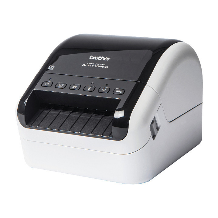 "Brother QL-1110NWB. Print technology: Direct thermal, Maximum resolution: 300 x 300 DPI, Print speed: 110 mm/sec. Connectivity technology: Wired & Wireless, Ethernet LAN, Wi-Fi, Bluetooth, Bluetooth version: 5.2, USB port. Tape type: DK. Product colour: Black, White"\n"This wide format shipping label printer has a 4 inch(101.6mm) print width - to offer maximum compatibility with various shipping label software packages. Easily send your products to a Fulfilled By Amazon (FBA) warehouse using the crop print function. Simply print the PDF that contains the multiple barcode labels from your FBA account, and let the driver detect, extract and print each individual label to the QL-1110NWB automatically. With USB, Ethernet, Wi-Fi and Bluetooth, you can choose to print labels from your PC, Mac, smartphone or tablet, whichever is most convenient. Plus with Apple MFi certification and AirPrint, all your connectivity options are covered. With a range of SDK's (Software Development Kits) for Windows, iOS and Android, the QL-1110NWB can be easily integrated into your own systems and software."