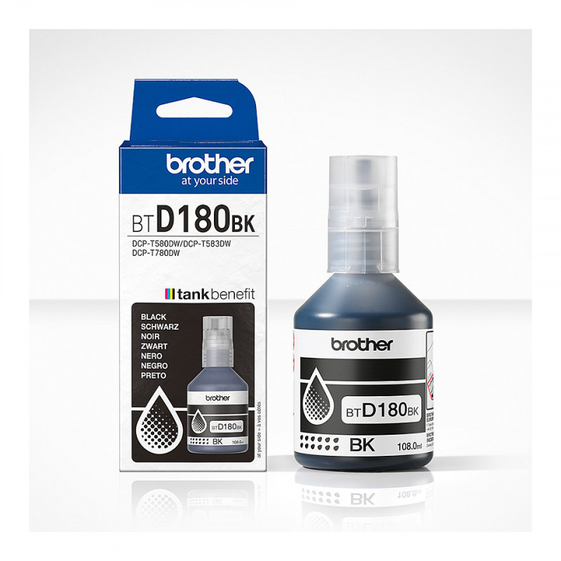 "Brother BTD180BK Black Genuine Ink Bottle. Type: Original, Printing colours: Black, Brand compatibility: Brother. Quantity per pack: 1 pc(s), Dimensions (WxDxH): 50 x 115 x 50 mm, Package width: 56 mm"\n"Designed to ensure quality documents every time you print, the genuine Brother BTD180BK black ink bottle provides a super high yield of 7,500 pages, so you can put an end to regular ink replenishment. Just fill up the ink tank and enjoy long-lasting professional quality prints."