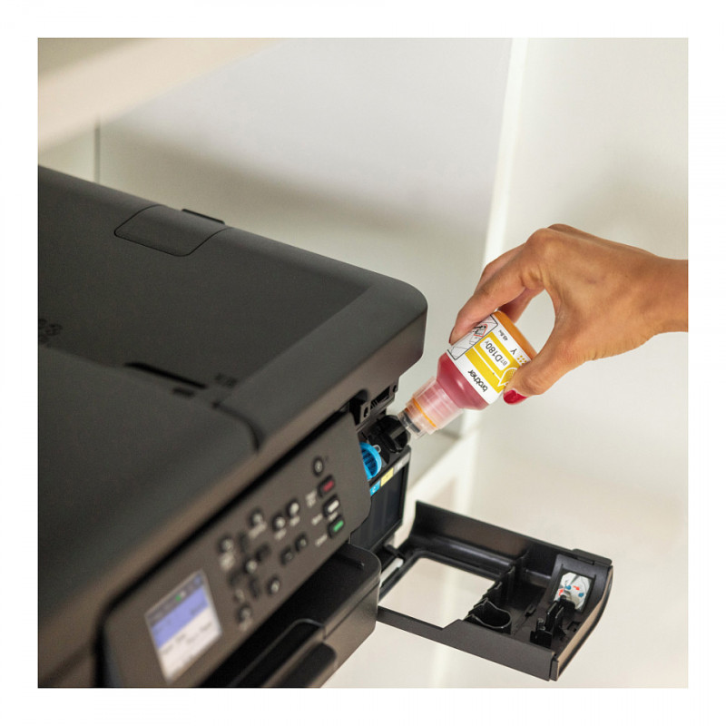 "Brother BTD180Y Yellow Genuine Ink Bottle. Type: Original, Printing colours: Yellow, Brand compatibility: Brother. Quantity per pack: 1 pc(s), Dimensions (WxDxH): 40 x 100 x 45 mm, Package width: 56 mm"\n"Designed to ensure quality documents every time you print, the genuine Brother BTD180Y yellow ink bottle provides a super high yield of 5000 pages, so you can put an end to regular ink replenishment. Just fill up the ink tank and enjoy long-lasting professional quality prints."