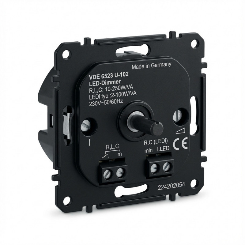 "Busch-Jaeger 6523 U-102. Type: Dimmer. Case design: Mountable, Control type: Rotary, Product colour: Black. AC input voltage: 230 V, AC input frequency: 50 - 60 Hz, Resistive load (max): 100 W"\n"With rotary control, two-way switch and soft-catch.