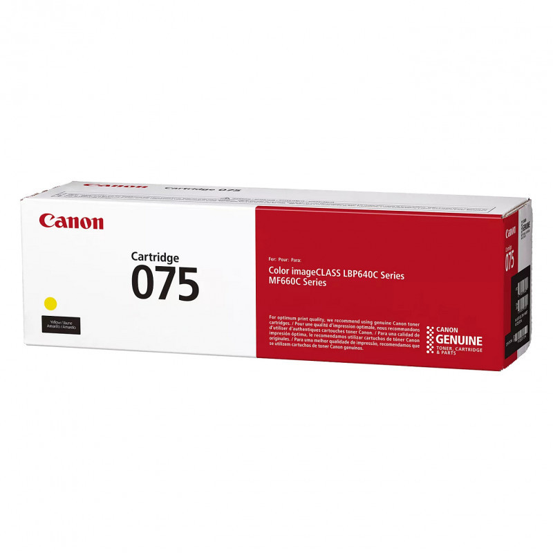 "Canon 075. Colour toner page yield: 1300 pages, Printing colours: Yellow, Quantity per pack: 1 pc(s)"\n"Canon consumables genuinely make a difference. When you choose a Canon printer, you’re investing in quality, reliability and value. Designed by Canon engineers and manufactured in Canon facilities, Genuine supplies are developed using precise specifications, so you can be confident that your Canon device will produce high-quality results consistently. Canon Genuine Toner produces high-quality, monochrome and color output for all your home and office needs, that you can be proud of."