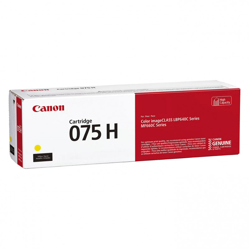"Canon 075 High Capacity. Colour toner page yield: 2500 pages, Printing colours: Yellow, Quantity per pack: 1 pc(s)"\n"Canon consumables genuinely make a difference. When you choose a Canon printer, you’re investing in quality, reliability and value. Designed by Canon engineers and manufactured in Canon facilities, Genuine supplies are developed using precise specifications, so you can be confident that your Canon device will produce high-quality results consistently. Canon Genuine Toner produces high-quality, monochrome and color output for all your home and office needs, that you can be proud of."