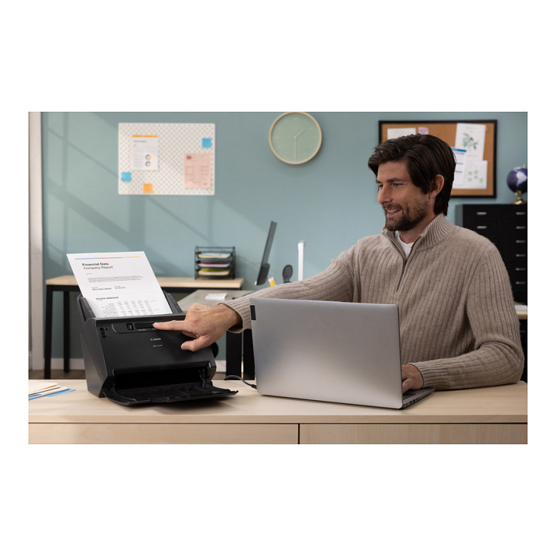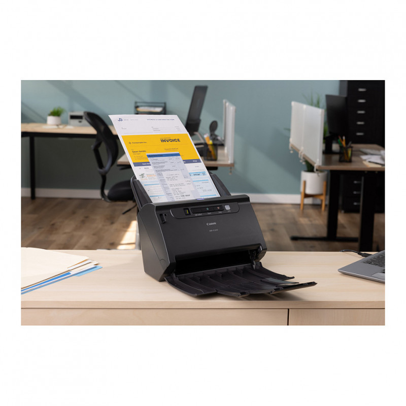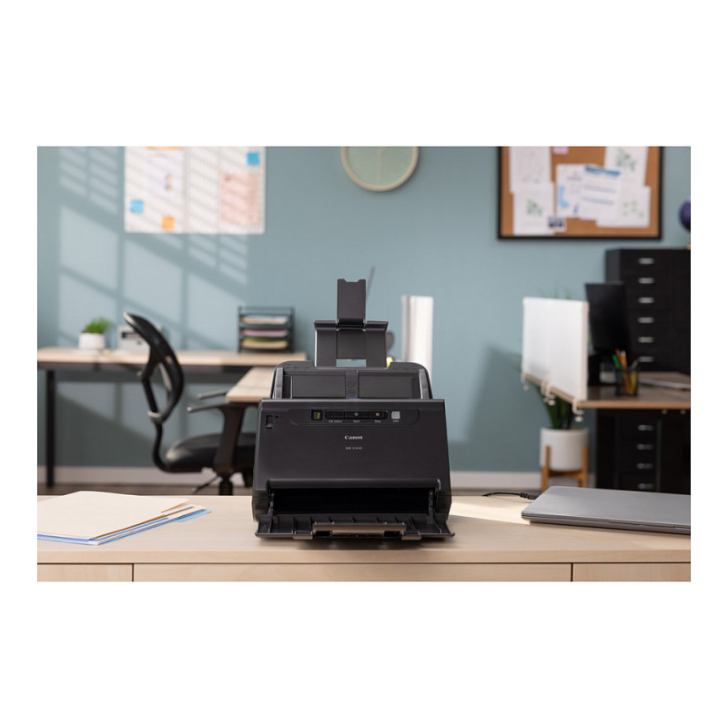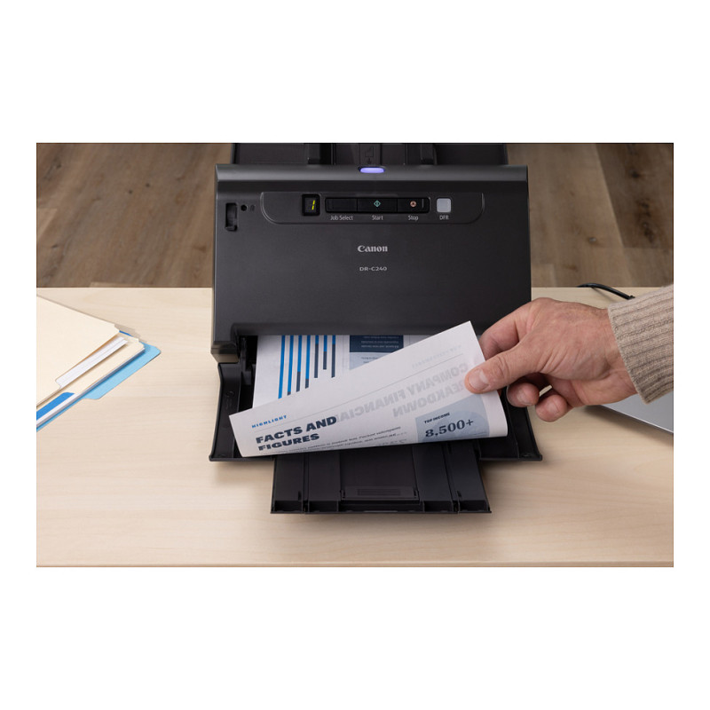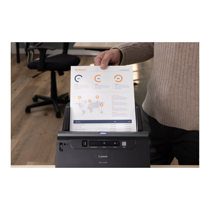 "Canon imageFORMULA DR-C240 Duplex Desktop Document Scanner. Maximum scan size: 216 x 3000 mm, Optical scanning resolution: 600 x 600 DPI, Input colour depth: 24 bit. Scanner type: Sheet-fed scanner, Product colour: Black. Sensor type: CMOS CIS, Daily duty cycle (max): 4000 pages, Light source: RGB LED. Maximum ISO A-series paper size: A4, Scanning media types supported: Business Card, Plastic Card. Standard interfaces: USB 2.0"\n"Canon imageFORMULA DR-C240