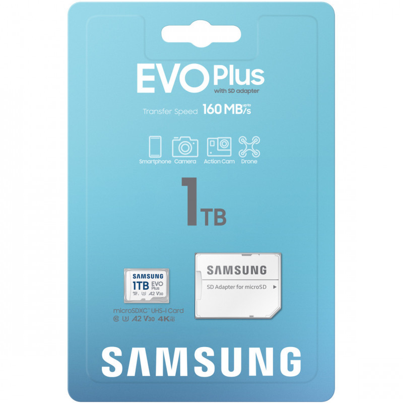 "Samsung MB-MC1T0S. Capacity: 1 TB, Flash card type: MicroSD, Internal memory type: UHS-I, Read speed: 160 MB/s, Write speed: 160 MB/s, UHS Speed Class: Class 3 (U3), Video Speed Class: V30. Product colour: Blue, White"\n"All the space you need