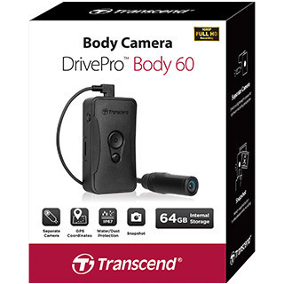 "Transcend DrivePro Body 60. HD type: Full HD, Main camera resolution: 1920 x 1080 pixels, Main camera viewing angle: 130°. Internal storage capacity: 64 GB. Interface type: USB. Power source type: Battery, Input operation voltage (max): 240 V, Battery technology: Lithium Polymer (LiPo). Width: 52.2 mm, Depth: 24.9 mm, Height: 95.9 mm"\n" Exmor high-sensitivity image sensor