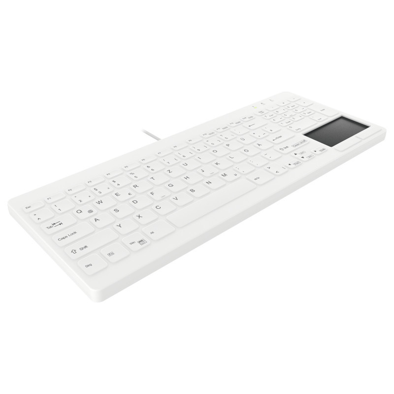 "Contour Design Active Key Contour QuickClean Medical Keyboard IP68 Touchpad Compact Wired White DE C7412. Keyboard form factor: Full-size (100%). Keyboard style: Straight. Connectivity technology: Wired, Device interface: USB, Keyboard key switch: Scissor key switch, Keyboard layout: QWERTZ, Keyboard number of keys: 95. Cable length: 1.8 m. Recommended usage: Medical. Product colour: White"\n"The AK-C7412 is a high quality notebook style PC-keyboard. The AK-C7412 impresses with precise key actuation and accurate key guidance. The purification and disinfection capacity makes it a perfect fit in hospitals. The silicone key membrane protects the key field against ingress of dirt and fluids."