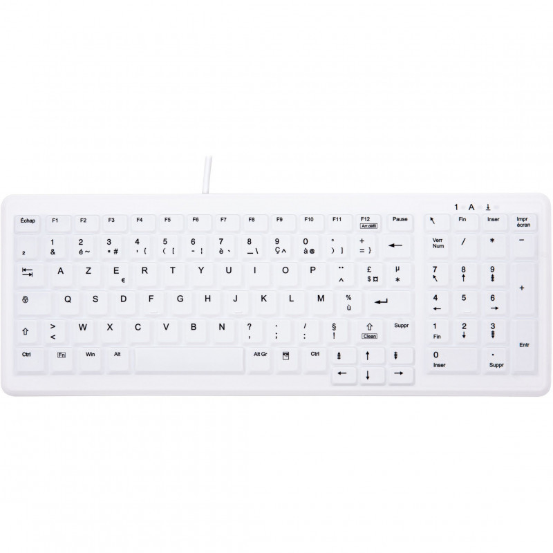 "CHERRY AK-C7000. Keyboard style: Straight. Connectivity technology: Wired, Device interface: USB, Keyboard key switch: Scissor key switch, Keyboard layout: AZERTY, Recommended usage: Medical. Product colour: White"\n"The AK-C7000 is a high quality, compact PC keyboard in a notebook design. The silicone membrane protects the keyfield against the ingress of dirt and splash water. Due to the smooth key actuation and the precise key guidance the AK-C7000 is highly recommended for the use in hygiene critical environments."