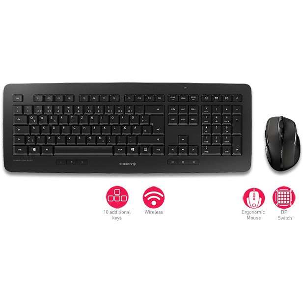 "CHERRY DW 5100. Keyboard form factor: Full-size (100%). Keyboard style: Straight. Connectivity technology: Wireless, Device interface: RF Wireless, Keyboard number of keys: 115, Recommended usage: Universal. Product colour: Black. Mouse included"\n"- Wireless desktop set with abrasion-proof laser inscription
