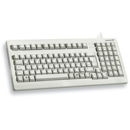 "CHERRY G80-1800. Keyboard form factor: Full-size (100%). Keyboard style: Straight. Connectivity technology: Wired, Device interface: USB, Keyboard layout: QWERTY, Keyboard number of keys: 104. Cable length: 1.75 m. Recommended usage: Universal. Product colour: Grey"\n"Standard? Yes! Boring? No - the compact design of the 19 inch PC keyboard is highly distinctive. For space-saving applications and optimum longevity requirements."