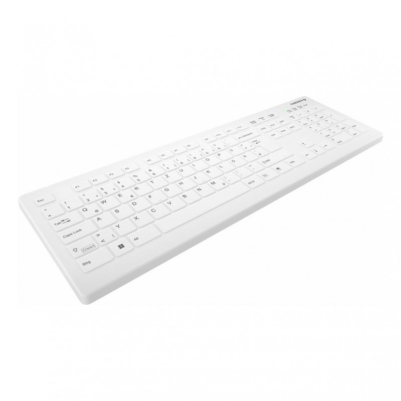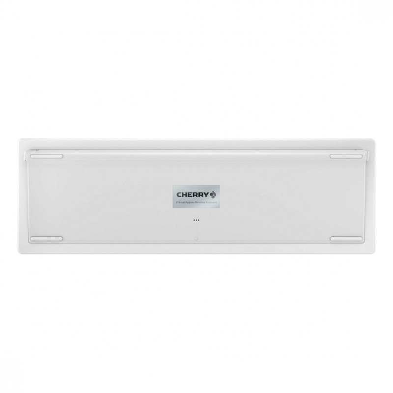 "CHERRY AK-C8112F. Keyboard form factor: Full-size (100%), Connectivity technology: Wireless, Device interface: RF Wireless, Keyboard key switch: Scissor key switch, Keyboard number of keys: 105, Recommended usage: Medical. Product colour: White"\n"The disinfectable, wireless Medical Keyboard AK-C8112 in full layout is highly versatile in hygiene-critical areas and lives up to the high demands of frequent users in hospitals and medical practices. The silicone cover and the especially flat key profile allow for the highest level of cleaning and disinfection. Being waterproof, the AK-C8112 can be sprayed, wiped or even immersed in disinfectants and the ultra-flat key profile prevents microbial growth on contaminants and disinfectant residues in gaps. Depending on the hygienic requirements, it is available with a removable membrane that can be autoclaved for sterilization or a permanently installed silicone membrane with IP68 rating. To make wipe disinfection even more efficient, the CleanFunction disables the key input, so you do not need to disconnect the keyboard. In addition to its cleaning capabilities, the AK-C8112 has compelling technical features. The easy key orientation, light keystroke, abrasion-resistant labeling and 2.4 GHz wireless connection make it a reliable, safe and durable tool in every medical setting. With the standard layout of 104 or 105 keys, the AK-C8112 combines all the advantages of a hygiene keyboard with the incomparable smooth and quiet typing experience of a premium office keyboard.