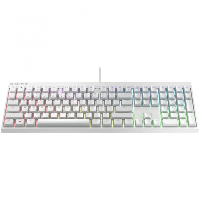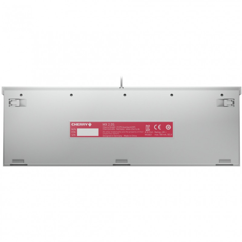 "CHERRY MX 2.0S. Keyboard form factor: Full-size (100%). Keyboard style: Straight. Connectivity technology: Wired, Device interface: USB, Keyboard key switch: Mechanical, Keyboard layout: QWERTZ, Keyboard number of keys: 110. Backlight type: RGB LED. Cable length: 1.8 m. Recommended usage: Gaming. Product colour: White"\n"The CHERRY MX 2.0S – the functional, classic keyboard that has everything you need for gaming. The streamlined German design concentrates on functionality, using the Bauhaus principle as its basis. Designed by Prof. Peter Raab, lecturer at Coburg University, the exterior and interior have been optimized. The interior features the time-tested mechanical CHERRY MX technology and provides a choice of four switching characteristics. Special Gold Crosspoint contacts ensure consistently reliable electrical contacts, perfect responsiveness, and an unbeatable reaction speed. Multiple mechanical components under each key ensure a uniform feel. Depending on the model, without lighting or with vivid RGB lighting effects in more than 16 million colors. A variety of plays of color, lighting modes and key assignments can be managed using the free CHERRY Utility software. A matching palm rest is available as an optional accessory to provide more comfort. High-quality workmanship and abrasion-resistant key caps provide unfailing reliability when gaming, at home, and at work.
