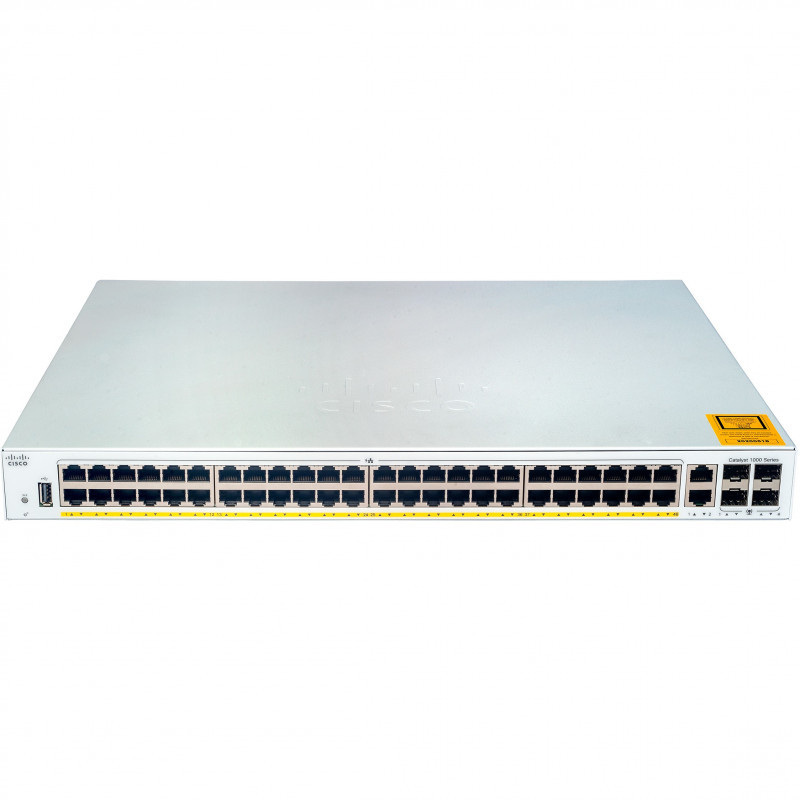 "Cisco Catalyst 1000-48P-4G-L Network Switch, 48 Gigabit Ethernet (GbE) PoE+ Ports, 370W PoE Budget, four 1 G SFP Uplink Ports, Enhanced Limited Lifetime Warranty (C1000-48P-4G-L). Switch type: Managed, Switch layer: L2. Basic switching RJ-45 Ethernet ports type: Gigabit Ethernet (10/100/1000), Basic switching RJ-45 Ethernet ports quantity: 48, USB 2.0 ports quantity: 1, Console port: RJ-45/Mini-USB. Full duplex. MAC address table: 16000 entries, Switching capacity: 104 Gbit/s. Networking standards: IEEE 802.1AX, IEEE 802.1D, IEEE 802.1Q, IEEE 802.1ab, IEEE 802.1p, IEEE 802.1s, IEEE 802.1w, IEEE.... Power over Ethernet (PoE)"\n"The Cisco Catalyst 1000-48P-4G-L Network Switch is an enterprise-class fixed managed Gigabit Ethernet Layer 2 switch designed for small businesses and branch offices. This simple, flexible and secure network switch is ideal for critical IoT (Internet of Things) deployments. It operates on Cisco IOS Software and features a CLI (command-line interface) as well as an intuitive web user interface."