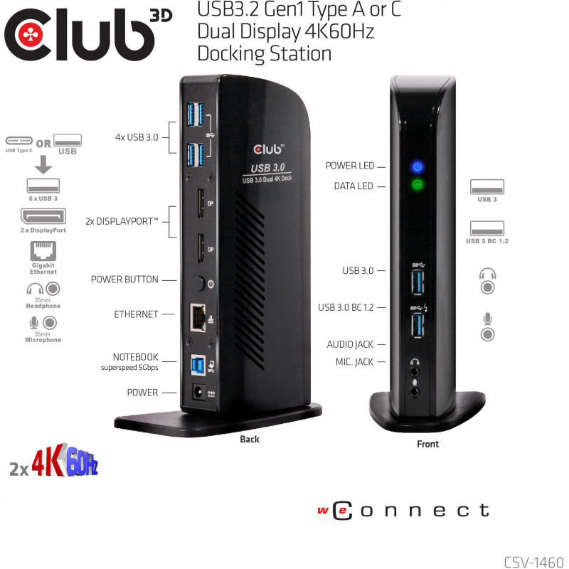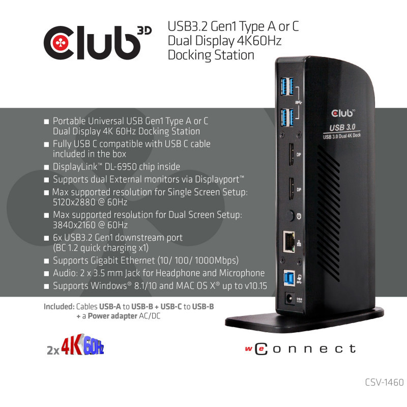 "CLUB3D USB3.2 Gen1 Type A or C Dual Display 4K60Hz Docking Station DisplayLink® Certified. Connectivity technology: Wired, Host interface: USB 3.2 Gen 1 (3.1 Gen 1) Type-A, Headphone connectivity: 3.5 mm. Ethernet LAN data rates: 10,100,1000 Mbit/s. Product colour: Black, Maximum digital resolution: 3840 x 2160 pixels, Country of origin: China. Power source type: AC, Output voltage: 20 V, Output current: 2.25 A. Windows operating systems supported: Windows 10, Windows 7, Windows 8"\n"CSV-1460 - The SenseVision USB 3.0 Dual Display 4K 60Hz Docking Station is designed to satisfy all your connectivity demands. It provides no less than 6 USB 3.0 Ports, Headphone connection, Microphone connection, Gigabit Ethernet port and 2 x Displayport outputs.
