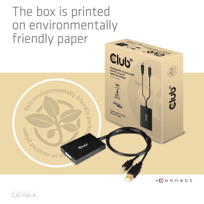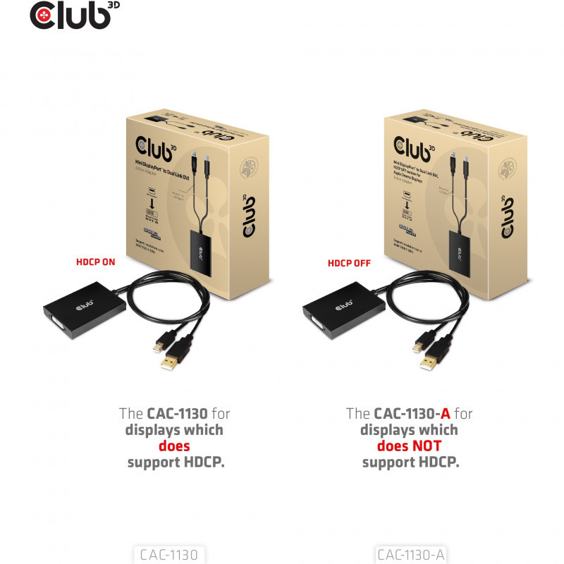 "CLUB3D Mini DisplayPort to Dual Link DVI, HDCP OFF version for Apple Cinema Displays Active Adapter. Cable length: 0.6 m, Connector 1: DVI-D, Connector 2: Mini DisplayPort + USB Type-A. Certification: ROHS, FCC, CE EMI. Connector 1 dimensions (WxDxH): 61 x 83 x 14 mm, Weight: 109 g. Package width: 145 mm, Package depth: 45 mm, Package height: 145 mm. Quantity per pack: 1 pc(s)"\n"The CAC-1130-A Mini DisplayPort™ + USB Type-A (for Power) to Dual Link DVI signal format converter, HDCP OFF version for Apple Cinema Displays or other displays which do not support HDCP. Seamlessly connect Mini DisplayPort™ based source to conventional DVI displays, such as CRT, LCD monitors and projectors. You can enjoy the ultimate widescreen canvas with a resolution of 2560 x 1440 @ 60Hz and up to 3840 x 2160 @ 30Hz on any other HDCP OFF capable display, like the Apple Cinema Display.