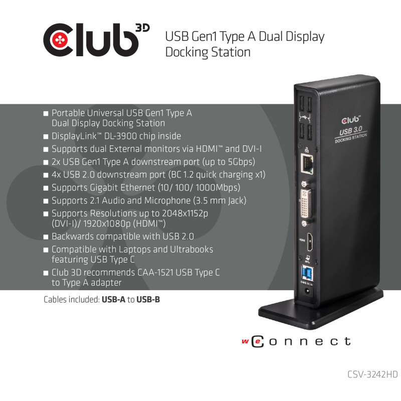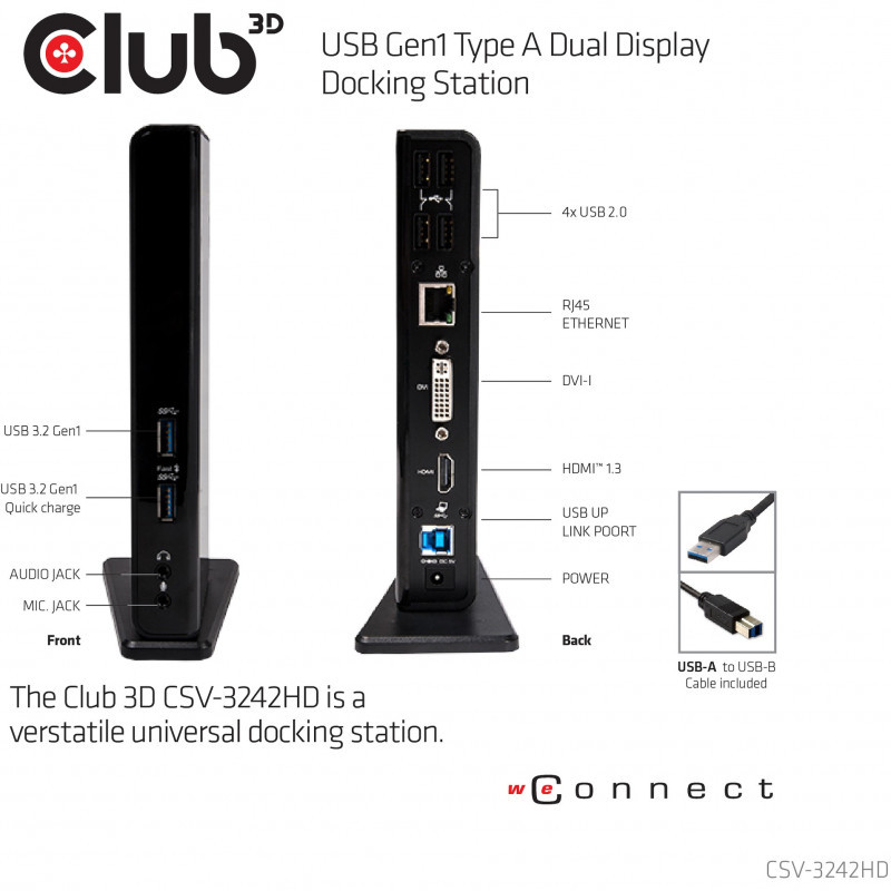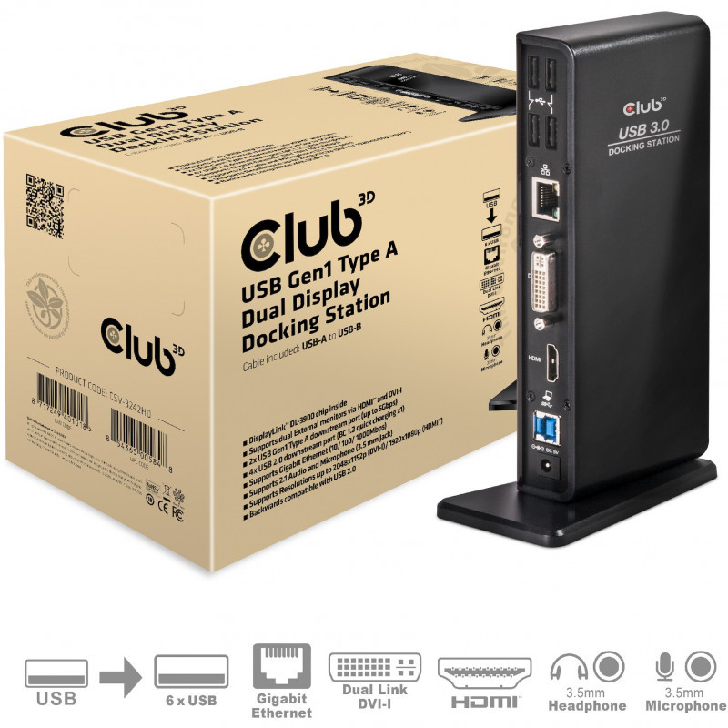 "CLUB3D USB Gen1 Type A Dual Display ( HDMI and DVI) DisplayLink™ Docking Station. Connectivity technology: Wired, Host interface: USB 3.2 Gen 1 (3.1 Gen 1) Type-A, HDMI version: 1.4a. Ethernet LAN data rates: 10,100,1000 Mbit/s. Product colour: Black, LED indicators: Activity, Operation, Compatibility: Lenovo Dell Acer Asus. MSI. Toshiba Apple HP Razer. Power source type: AC. Windows operating systems supported: Windows 10, Windows 10 Education, Windows 10 Education x64, Windows 10 Enterprise, Windows 10..."\n"SenseVision USB 3.0 Dual Display Docking Station