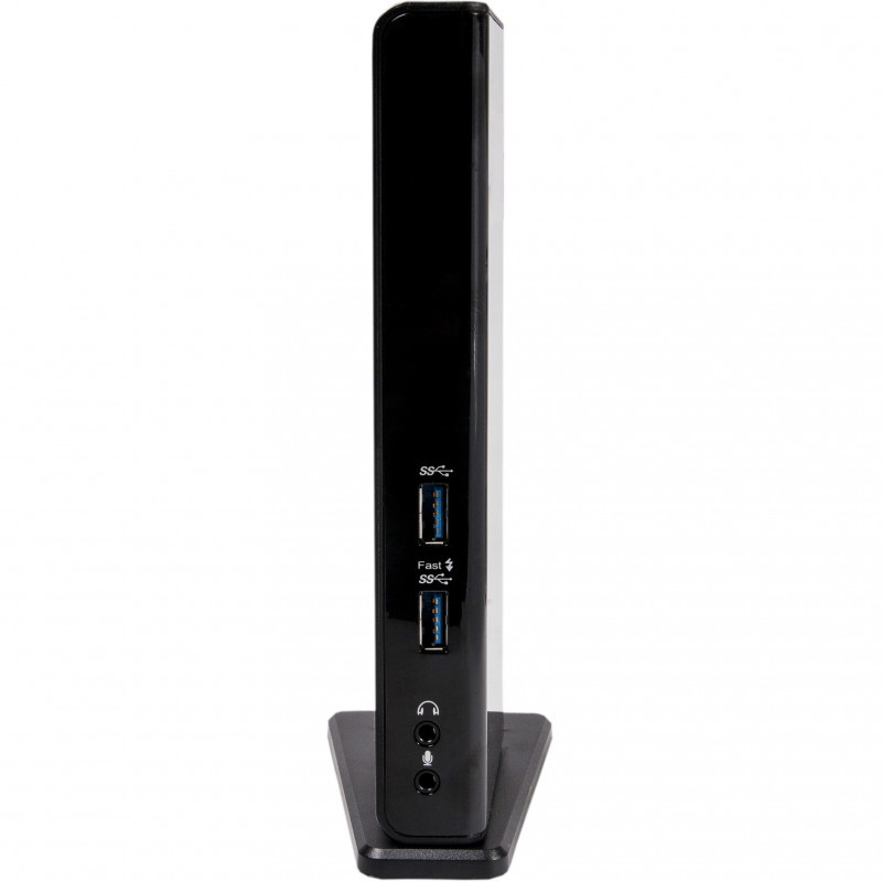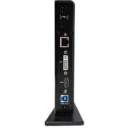 The USB 3.0 dual display docking station is designed for extra connectivity demands. With the docking station, you can extend the connection of a computer to more USB peripherals, Ethernet network, the speaker and the microphone through one single USB cable.