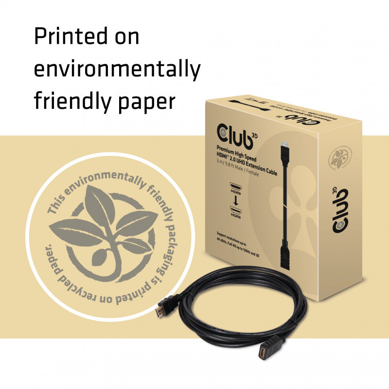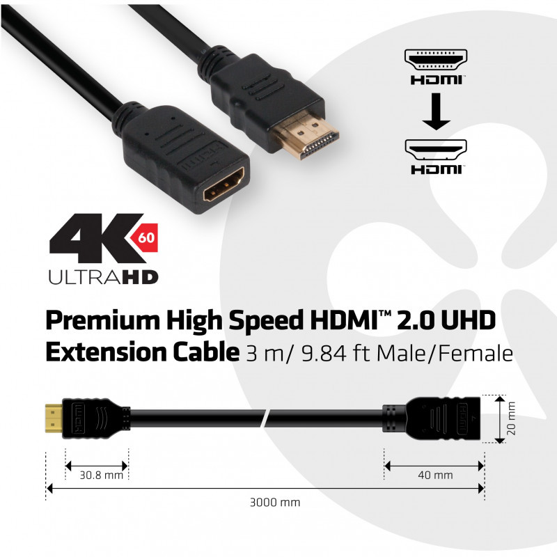 "CLUB3D High Speed HDMI™ 2.0 4K60Hz Extension Cable 3m/ 9.8ft Male/Female. Cable length: 3 m, Connector 1: HDMI Type A (Standard), Connector 1 gender: Male, Connector 2: HDMI Type A (Standard), Connector 2 gender: Female, Connector contacts plating: Gold, HDMI version: 2.0, 3D, Data transfer rate: 10.2 Gbit/s, Product colour: Black"\n"CAC-1321 This High Speed HDMI™ 2.0 UHD HDR Extension Cable, enables you to extend your existing HDMI™ cable length by 3 Meters / 9.8 Feet. Nowadays we have many devices that we want to connect to your TV which makes this product a great solution because it creates flexibility for the placing of such devices.