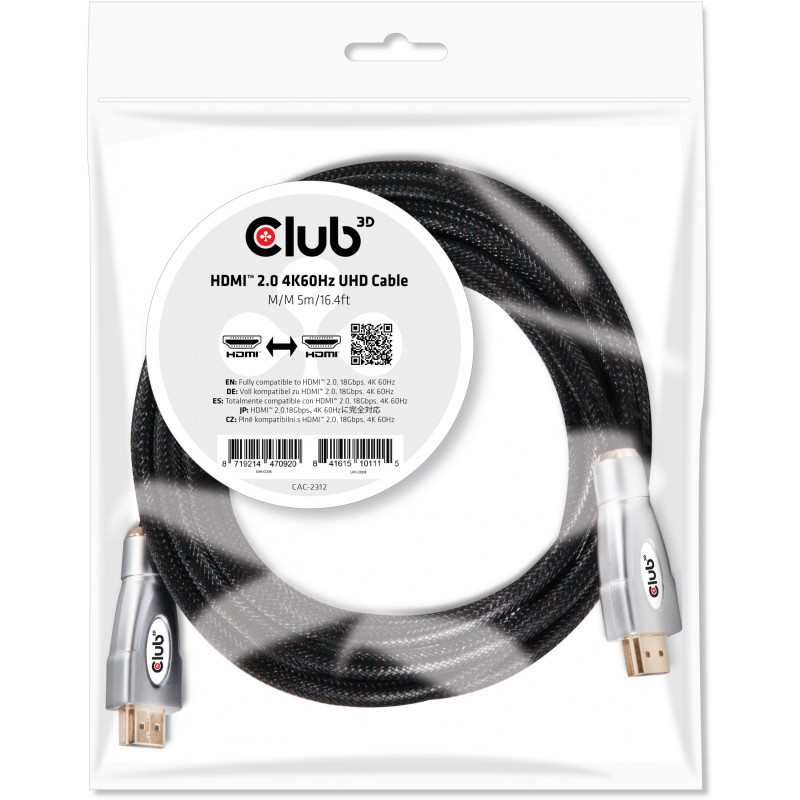 "CLUB3D HDMI 2.0 4K60Hz UHD Cable 5m/16.4ft. Cable length: 5 m, Connector 1: HDMI Type A (Standard), Connector 1 gender: Male, Connector 2: HDMI Type A (Standard), Connector 2 gender: Male, Connector contacts plating: Gold, HDMI version: 2.0a, 3D, Data transfer rate: 18 Gbit/s, Product colour: Black"\n"CAC-2312 - The Club 3D HDMI™ 2.0 4K60Hz UHD Cable enables the connection of your HDMI™ supported Gaming PC or Laptop to an (Ultra) High Definition Monitor or other HDMI™ supported device.