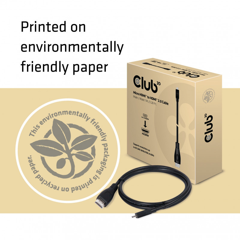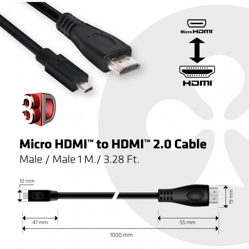 "CLUB3D Micro HDMI™ to HDMI™ 2.0 4K60Hz Cable 1M / 3.28Ft. Cable length: 1 m, Connector 1: HDMI Type D (Micro), Connector 1 gender: Male, Connector 2: HDMI Type A (Standard), Connector 2 gender: Male, HDMI version: 2.0, 3D, Data transfer rate: 18 Gbit/s, Product colour: Black"\n"CAC-1351 The Club 3D Micro HDMI™ to HDMI™ 2.0 Cable delivers an UHD resolution signal for clear, natural pictures and sound. It enables you to connect your Digital Camera/Camcorder, Mini PC, Pico Projector or other device with Micro HDMI™output to a 4K UHD TV, monitor or projector with HDMI™ input. It fully supports the Premium High Speed HDMI™ with Ethernet’ specification, ensuring that video up to 4K UHD 3840x2160p at 60Hz is supported, as well as HDR, audio and data streams.