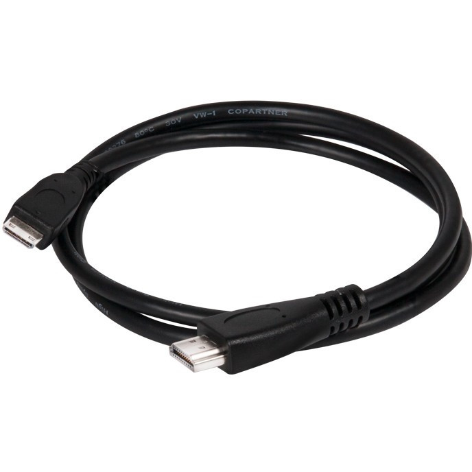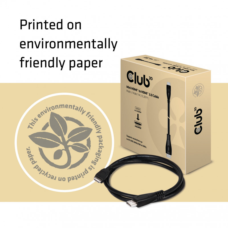 "CLUB3D Mini HDMI™ to HDMI™ 2.0 4K60Hz Cable 1M / 3.28Ft. Cable length: 1 m, Connector 1: HDMI Type C (Mini), Connector 1 gender: Male, Connector 2: HDMI Type A (Standard), Connector 2 gender: Male, HDMI version: 2.0, Data transfer rate: 18 Gbit/s, Product colour: Black"\n"CAC-1350 The Club 3D Mini HDMI™ to HDMI™ 2.0 Cable delivers an UHD resolution signal for clear, natural pictures and sound. It enables you to connect your Digital Camera/Camcorder, Mini PC, Pico Projector or other device with Mini HDMI™ output to a 4K UHD TV, monitor or projector with HDMI™ input. It fully supports the Premium High Speed HDMI™ with Ethernet specification, ensuring that video up to 4K UHD 3840x2160p at 60Hz is supported, as well as HDR, audio and data streams.