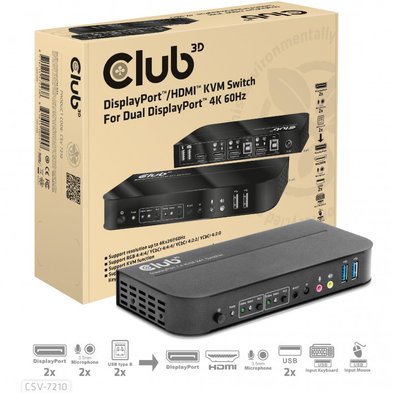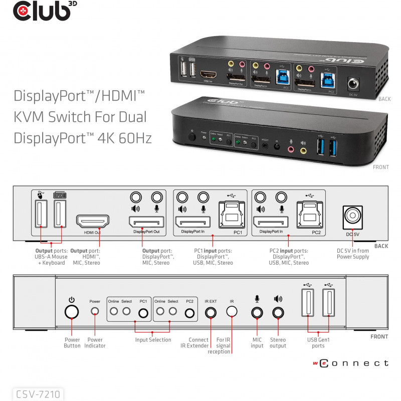 "CLUB3D DisplayPort/HDMI KVM Switch For Dual DisplayPort 4K 60Hz. Keyboard port type: USB, Mouse port type: USB, Video port type: HDMI/DisplayPort. HD type: 4K Ultra HD, Maximum resolution: 4096 x 2160 pixels, Video bandwidth: 60 Hz. Product colour: Black, Housing material: Metal. Power source: DC, Input voltage: 5 V, Power consumption (typical): 12 W. Width: 178 mm, Depth: 75 mm, Height: 26 mm"\n"The CSV-7210 is a high performance DisplayPort™ KVM (Keyboard Video and Mouse) switcher. It routes high definition videos up to 4096x2160 at 60Hz resolution and audio from any DisplayPort™ source to any HDMI™ or DisplayPort™ supported display. This DisplayPort™ KVM switcher not only has the key press switching function, but also has an intelligent function as well as hot pluggable function."