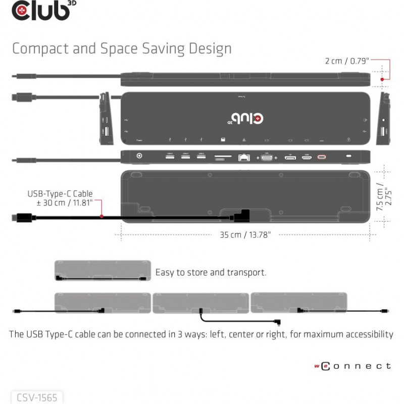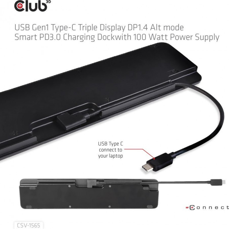 "CLUB3D USB Gen1 Type-C Triple Display DP1.4 Alt mode Smart PD3.0 Charging Dock with 100 Watt Power Supply. Connectivity technology: Docking, Host interface: USB 3.2 Gen 1 (3.1 Gen 1) Type-C. Product colour: Black"\n"The Club-3D CSV-1565 USB Gen1 Type-C Triple Display DP1.4 Alt mode Smart PD3.0 Charging Dock is an integrated solution combining Video, Data, Power, Ethernet and Audio especially for frequent travellers. The Three different Video ports(HDMI™, DisplayPort™, VGA) allow you to enjoy 3 different images(1x HDMI™ 4K60Hz+1x DP™ 4K60Hz+1x VGA 1920x1080@60Hz) or videos on 3 different displays(1x 4K30Hz+2x1080p@60Hz) outputs under MST mode simultaneously. The USB Type-A ports and USB Type-C data port allow you to connect multiple USB devices to the host. The USB Type-C charging port allows you to provide power for this Dock and can charge the host PC at the same time by connecting a PD3.0 power Adapter, no need to carry your Notebooks PowerSupply. So in general the user is travelling lighter. The Micro SD and SD/MMC ports allow you to read information in the memory card onto the host. The 3.5mm audio port allows enjoying music of the host via a headset. Besides, with the Gigabit Ethernet port, you can enjoy high speed Ethernet on the host. It supports all DP1.4 Alt mode supported hosts. (PC, Laptop, Mobile phone, etc.) Dynamic Current Detection and Power Distribution, the product no longer intercepts the fixed power from the external PD3.0 Power Supply, but intercepts it according to the actual power consumed by itself, so that the PC can be dynamically charged more power. For Video Signal the source device needs to support DisplayPort™1.4 Alt Mode."