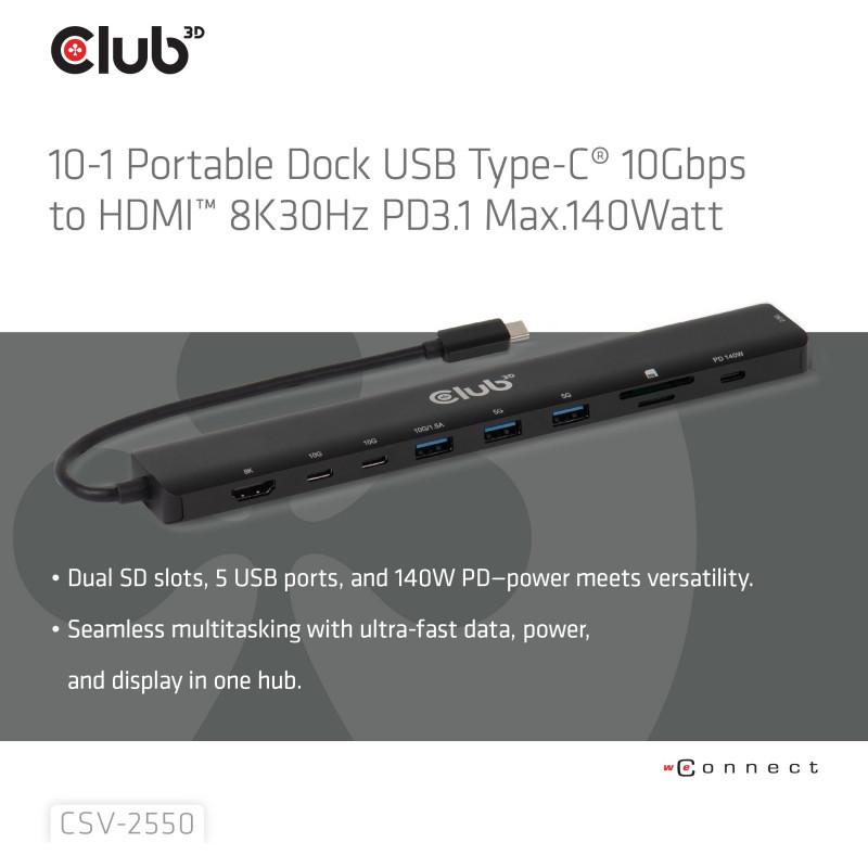 "CLUB3D 10-1 Portable Dock USB Type-C® 10Gbps to HDMI™ 8K30Hz PD3.1 Max.140Watt. Host interface: USB Type-C"\n