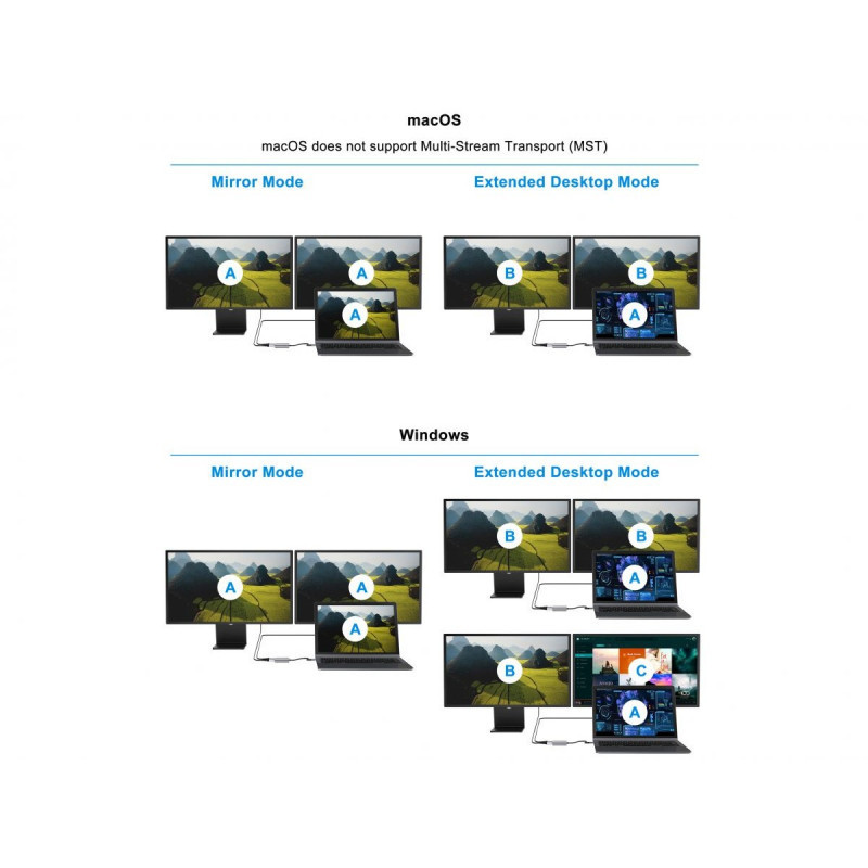 Multi Stream Transport, or MST, is a means of connecting one or more monitors together via a single display port. This technology makes it possible to connect say, two monitors to a laptop, using a docking station. This works by combining multiple video signals into one single stream and then ‘unpacking;’ them again on the display side. MST works on any Windows® device that supports DP Alt Mode (DisplayPort Alternate Mode), using USB-C.