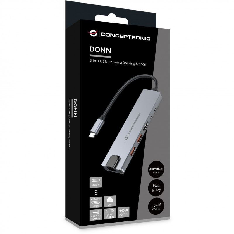 "Conceptronic DONN29G 6-in-1 USB 3.2 Gen 2 Docking Station, 4K60Hz HDMI, USB-A 10Gbps x 2, USB-C 10Gbps, GbE LAN, 140W USB PD 3.1. Connectivity technology: Wired, Host interface: USB 3.2 Gen 2 (3.1 Gen 2) Type-C, USB Power Delivery up to: 140 W. Ethernet LAN data rates: 10,100,1000 Mbit/s, Networking standards: IEEE 802.3ab. Product colour: Grey, Data transfer rate: 10 Gbit/s, Housing material: Aluminium. Power source type: USB, USB cable length: 0.25 m. Windows operating systems supported: Windows 10, Windows 10 Education, Windows 10 Education x64, Windows 10 Enterprise, Windows 10..., Mac operating systems supported: Mac OS X 10.10 Yosemite, Mac OS X 10.11 El Capitan, Mac OS X 10.12 Sierra, Mac OS X 10.13 High..., Mobile operating systems supported: Android 10.0, Android 11.0, Android 12.0, Android 13.0, Android 14.0, Android 5.0, Android 5.1,..."\n"This 6-in-1 Docking Station expands your device’s USB Type-C functionality with HDMI, USB-C PD, USB-C (10Gbps), USB-A (10Gbps), and RJ45 ports. It’s an ideal solution for MacBooks or Windows laptops with built-in wireless connectivity but no Ethernet port. Featuring a Gigabit Ethernet connection, it ensures fast and reliable wired network access. Additionally, the docking station supports up to 140W power delivery for compatible laptops or tablets with USB-C PD 3.1 support.